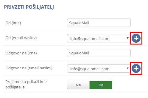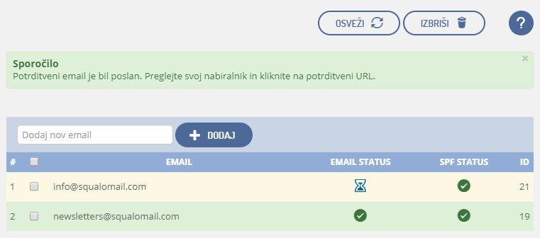 S klikom na plus poleg email naslova pošiljatelja lahko dodate novega pošiljatelja oziroma pregledujete statuse dodanih pošiljateljev.