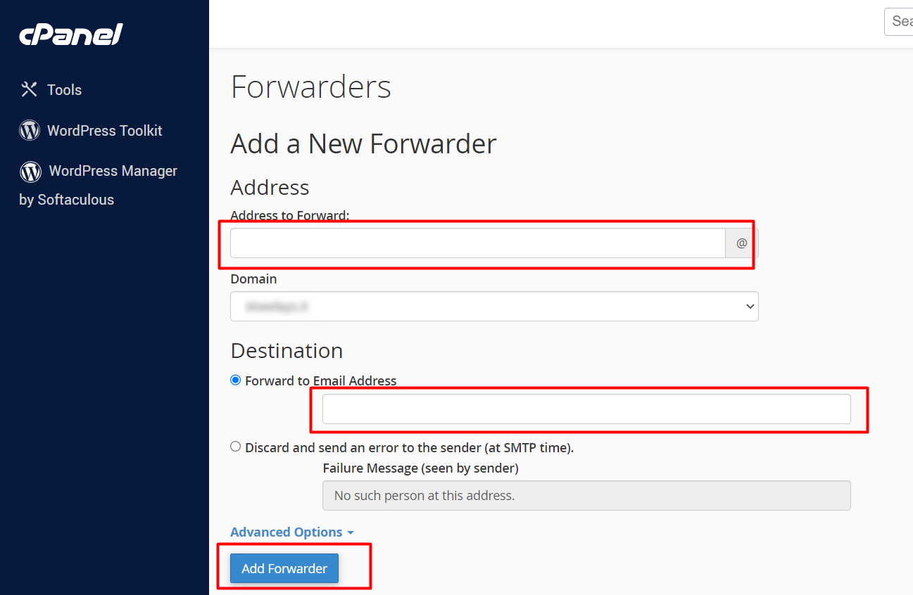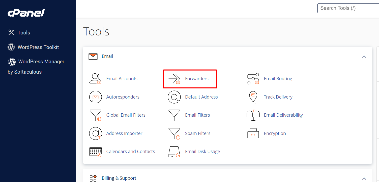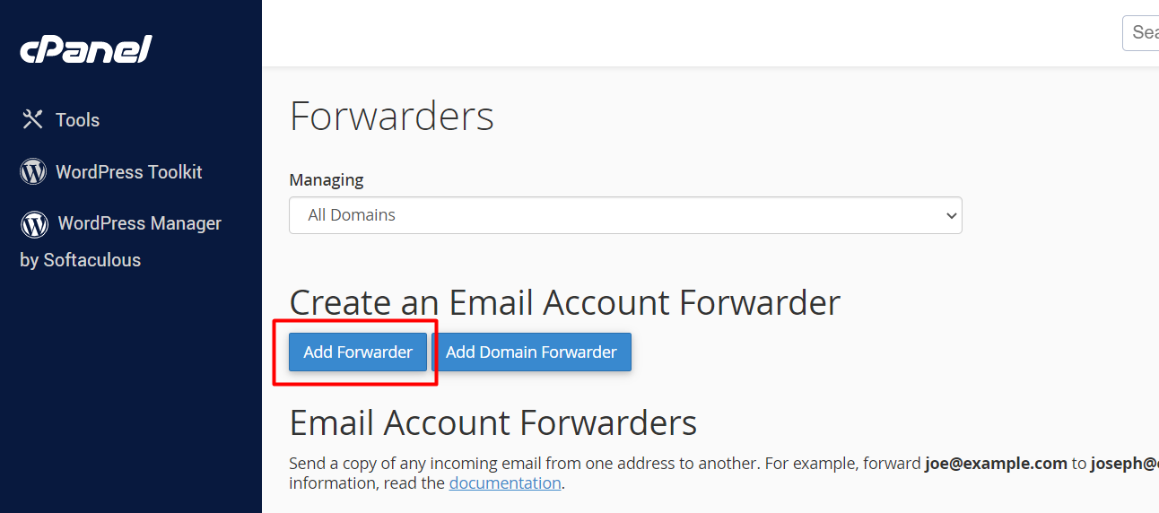 Če želite nastaviti Poštni predal za odboje po meri, kliknite na Forwarders: