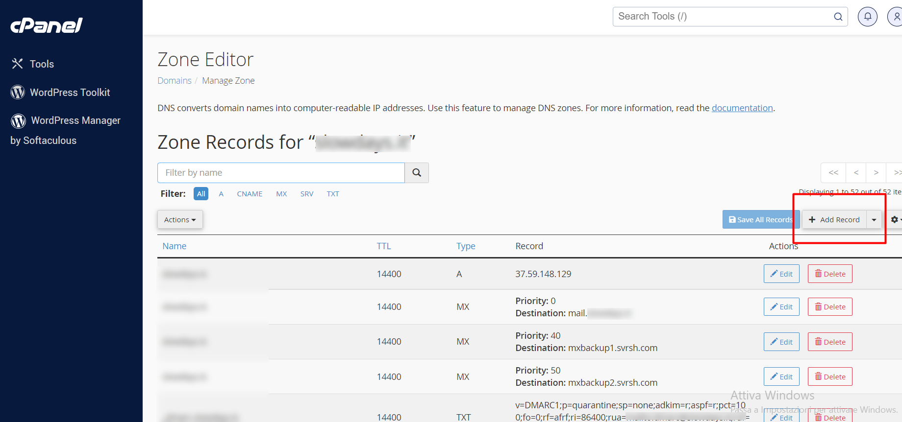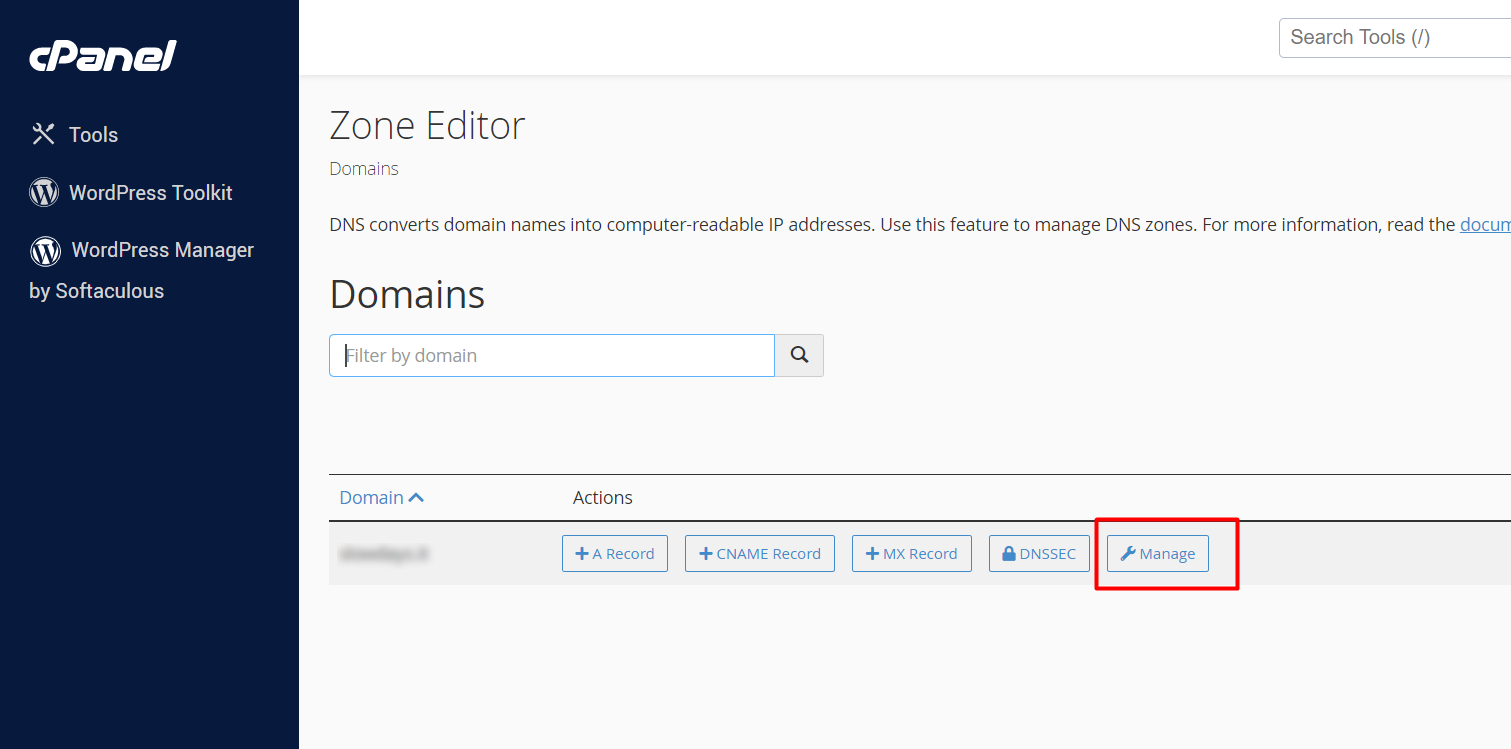 Ko ste v urejevalniku DNS, kliknite na Manage, da vidite vse zapise DNS:
