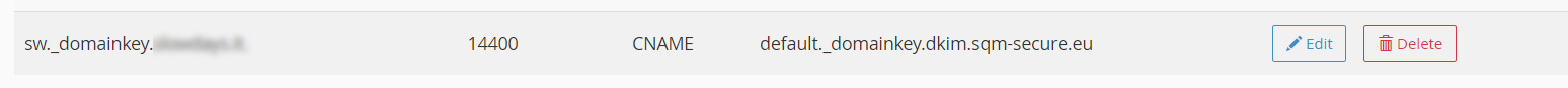 Pod postavko Name je potrebno vnesti sw._domainkey.domain. (kjer je domain domena, ki se uporablja za pošiljanje), pod Record pa vnesemo default._domainkey.dkim.sqm-secure.eu.