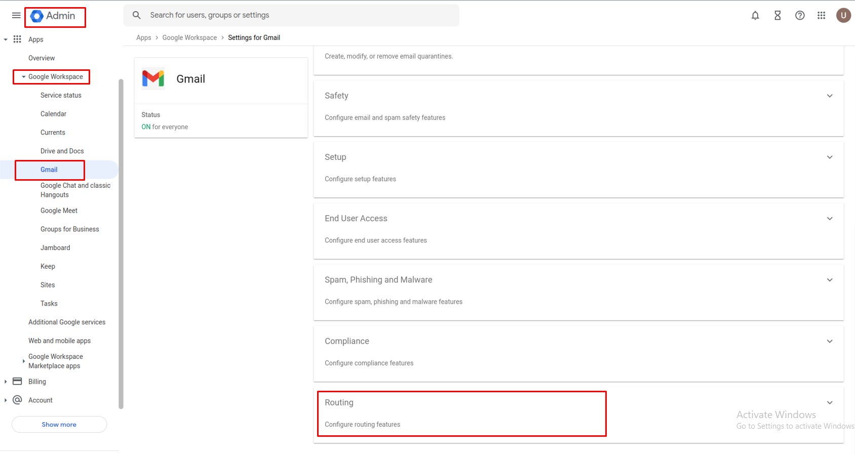 Ko vstopimo, na levi strnai kliknemo na Google Workspace – Gmail – Routing: