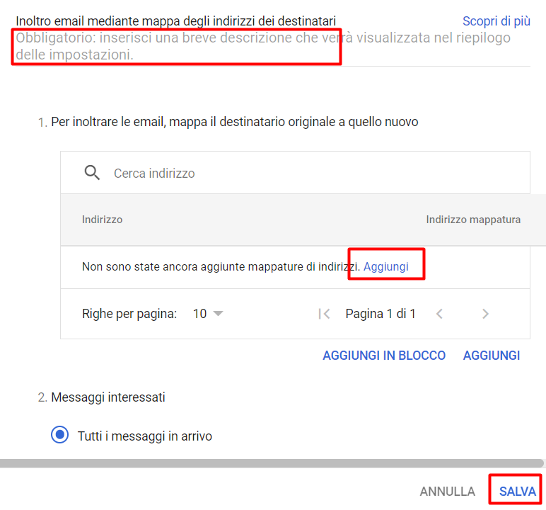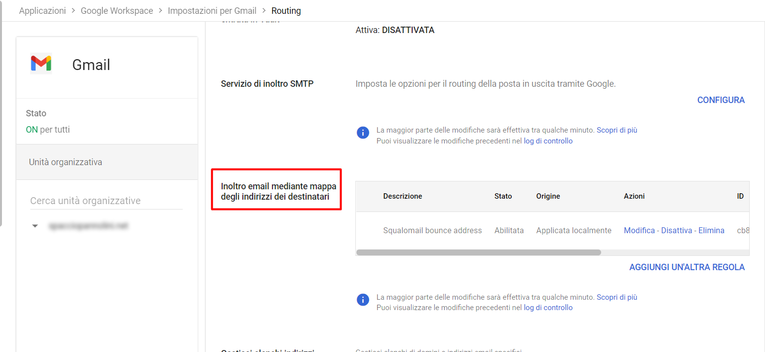 Ko vstopimo, najprej določimo ime za Email forwarding using recipient address map (na primer, lahko vnesete Squalo Custom Bounce).