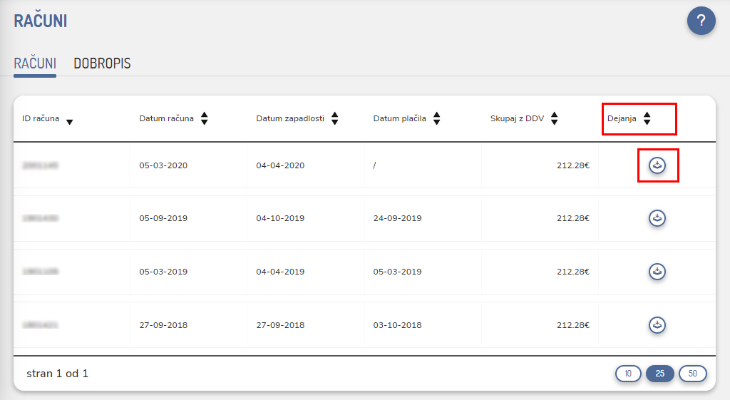 S klikom na gumb Prenesi račun (stolpec Dejanja), pa lahko račun tudi prenesete na vaš računalnik.