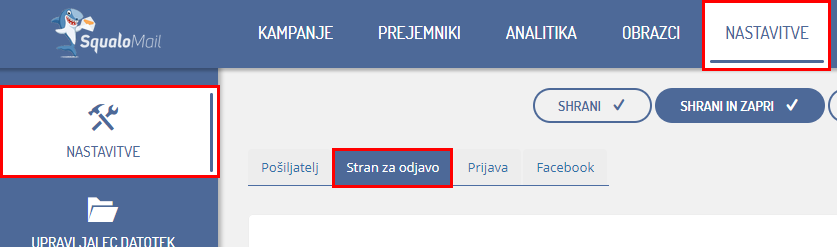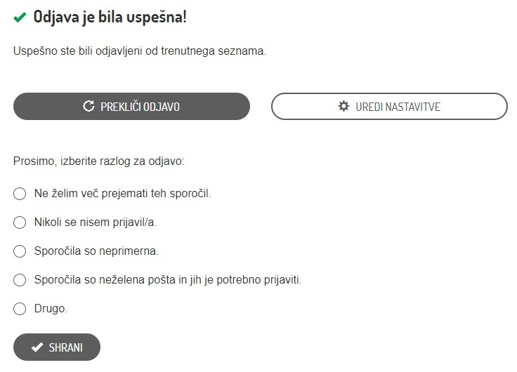 *OPOMBA: Takšen način odjave je v veljavi od 1.10.2018. Do tega dne pa je odjava delovala dvostopenjsko, kar pomeni, da je prejemnika po kliku na povezavo za odjavo najprej preusmerilo na stran za odjavo, kjer je moral izbrati, od česa se odjavlja. Svojo odjavo je nato potrdil šele s klikom na gumb Odjava. Sedaj pa je odjava enostopenjska, kar pomeni, da se prejemnik takoj odjavi, ko klikne na povezavo za odjavo. Od česa se odjavi pa določi uporabnik aplikacije.