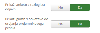 4. Določite za DA ali NE ali želite, da se na odjavni strani prikaže anketa z razlogi za odjavo. Prejemniku bodo v anketi na voljo naslednji razlogi:
