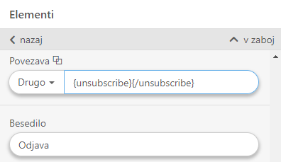 V besedilu označite besedo, ki bo vodilo na odjavo in kliknite na znak za povezavo. V polje za URL naslov vstavite {unsubscribe}{/unsubscribe}. Urejevalnik samodejno zazna, da gre za protokol <drugo>. S takim načinom vstavljanja povezave lahko sami določite barvo in podčrtanost povezave. To pa določite v urejevalniku Tipografije.