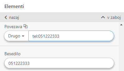 Lahko vstavite povezavo v telefonsko številko in s tem omogočite, da uporabnik neposredno s klikom na številko vzpostavi klic. V Besedilu označite telefonsko številko in kliknite na znak za povezavo. V polje za URL naslov vstavite npr.: tel:051222333.