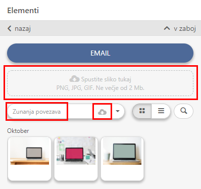 Slike lahko naložite iz računalnika ali pa vstavite URL povezavo slike in jo shranite v galerijo.