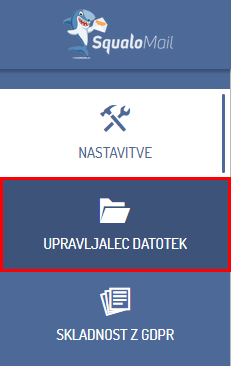 Z vsemi datotekami, ki ste jih naložili, lahko upravljate tudi v Upravljalcu datotek. Do upravljalca dostopate v glavnem meniju aplikacije Squalo (zgoraj) s klikom na Nastavitve in v meniju na levi strani Upravljalec datotek.