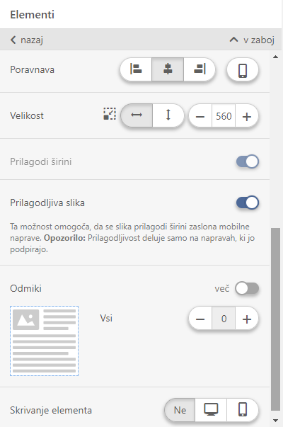 - Prilagodljiva slika – to pomeni, da se bo slika kljub manjši velikosti razpotegnila čez celotno širino mobilnega ekrana. Če to možnost izključite, bo slika ostala tudi na mobilnih ekranih enake širine kot na namizju.