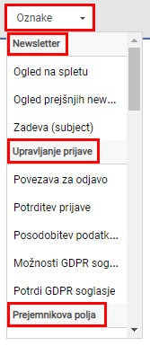 Funkcijo Oznake najdete v preprostem urejevalniku besedila, zgoraj desno, kjer imate na izbiro 3 sklope povezav, in sicer Newsletter, Upravljanje prijave in Prejemnikova polja.
