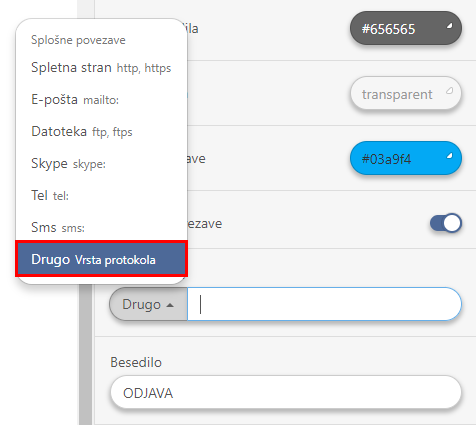 Takšne tipe povezav lahko vstavite v elemente, ki dovoljujejo vstavljanje povezav (tekst, naslov, gumb, slika). Na voljo so vam naslednje povezave: