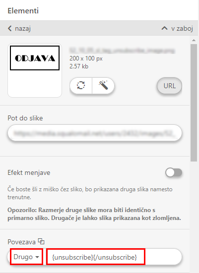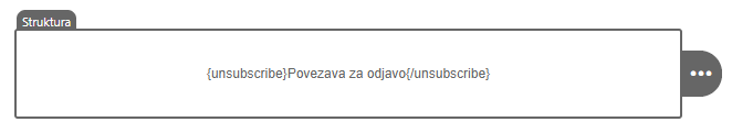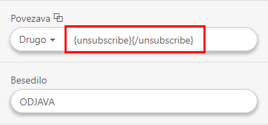 V tekstovnem elementu v nogi newsletterja označite besedilo Odjava in v polje za URL vpišite {unsubscribe}{/unsubscribe}.