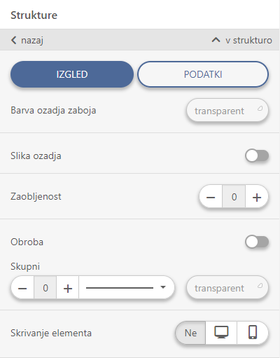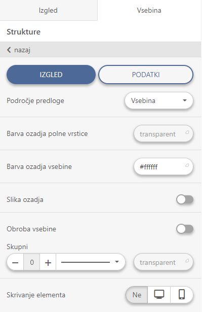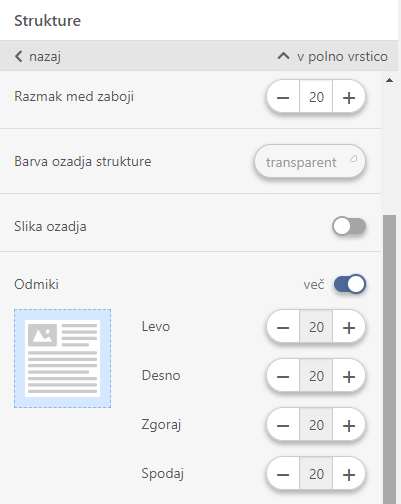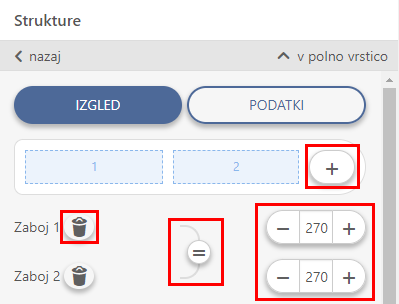 Z uporabo Struktur lahko s klikom na gumb + razdelite vrstico na 1, 2 ali več (največ 8) stolpcev/zabojev, ki jim lahko spreminjate širino, jih izenačite s klikom na gumb je enako (=), ali izbrišete s klikom na ikono koša za smeti.