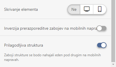 - Z možnostjo Prilagodljiva struktura lahko omogočite, da se stolpci razporedijo, torej se prikažejo v enem stolpcu (en pod drugim), ali pa to možnost izključite in vsi stolpci ostanejo tudi na mobilnih napravah v eni vrstici.