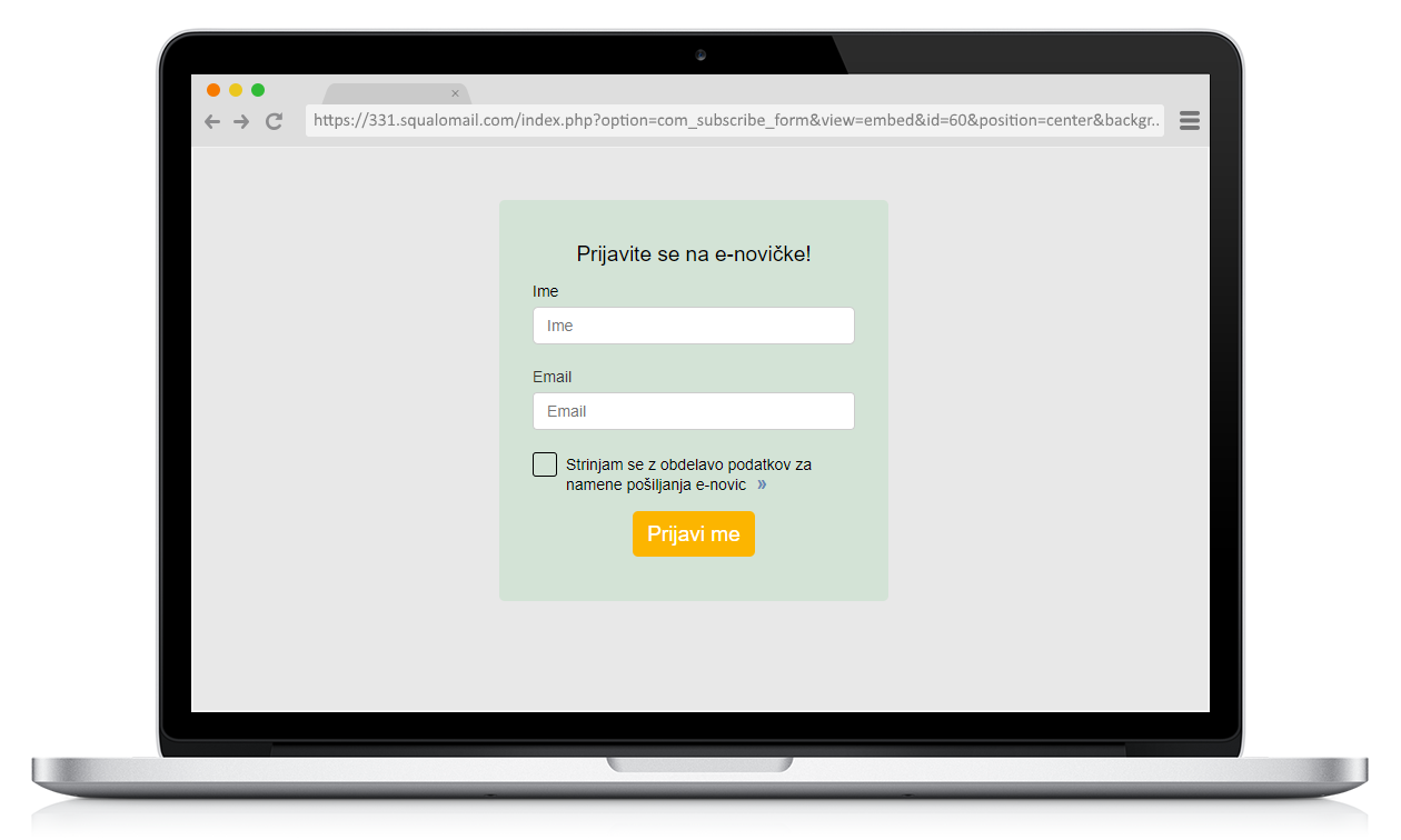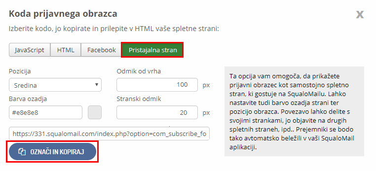 Ta opcija vam omogoča, da prikažete prijavni obrazec kot samostojno spletno stran, ki gostuje na Squalo. Lahko nastavite tudi barvo ozadja strani ter pozicijo obrazca. Povezavo lahko delite s svojimi strankami, jo objavite na drugih spletnih straneh, ipd.. Prejemniki se bodo tako avtomatsko beležili v vaši Squalo aplikaciji. Navodila:
