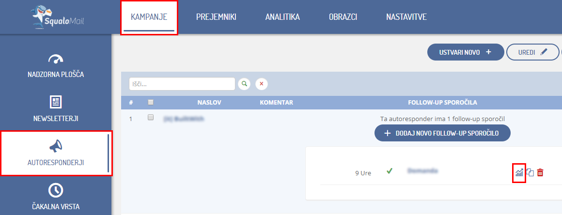 Kratek povzetek statističnih podatkov za poslano follow-up sporočilo je viden v seznamu follow-up sporočil za posamezen autoresponder (Kampanje > Autoresponderji) s klikom na ikono grafa poleg naslova follow-up sporočila.