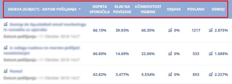 Koliko prejemnikov se je odjavilo. S klikom na številko lahko vidite vse prejemnike, ki so se odjavili, kdaj in iz kakšnih razlogov. Te podatke lahko pregledujete tudi v grafični obliki s klikom na ikono grafa poleg številke. Če kliknete na številko ali graf lahko s klikom na Izvozi te podatke tudi izvozite. - POSLANO