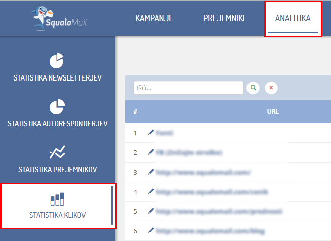 Statistika klikov omogoča spremljanje števila klikov na posamezno povezavo znotraj newsletterja. Dostopna je na Glavnem meniju > Analitika > Statistika klikov.