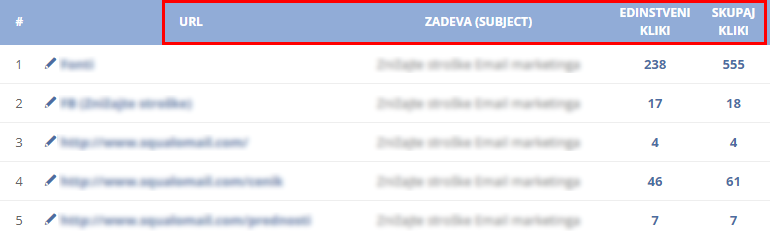Navedeni so URL naslovi, ki se nahajajo znotraj določenega newsletterja in na katerih je bil opravljen vsaj en klik. S klikom na ikono pisala pred URL naslovom lahko le-tega preimenujete (zaradi boljše sledljivosti vam svetujemo, da to storite). - ZADEVA (SUBJECT)