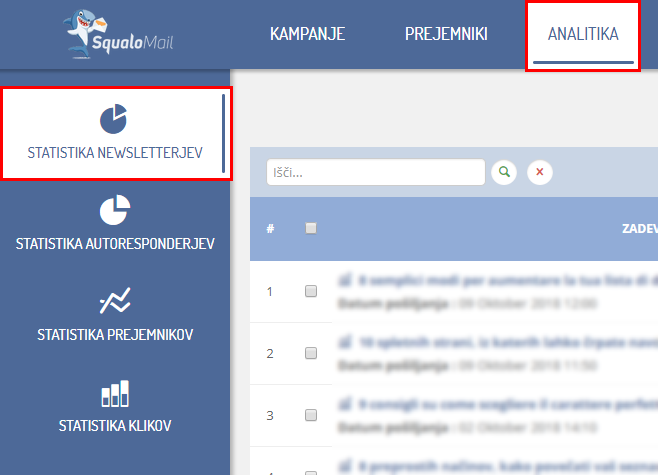 Do celotne statistike newsletterjev pa dostopate na Glavnem meniju > Analitika > Statistika newsletterjev.