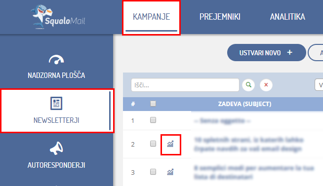 Kratek povzetek statističnih podatkov za poslani newsletter je viden v seznamu newsletterjev (Kampanje > Newsletterji) s klikom na ikono grafa poleg naslova newsletterja.