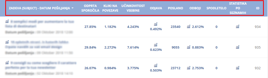 Odpre se vam seznam poslanih newsletterjev, kjer lahko po stolpcih spremljate naslednje podatke: