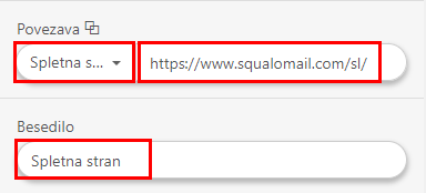 OPOMBA: Napačno je, če povezavo vstavite neposredno v besedilo (na primer tako: https://www.squalo.si/), saj se ob pošiljanju povezava spremeni (dodajo se UTM parametri), kar email odjemalci zaznajo kot SPAM.