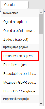- Lahko uporabite našo avtomatsko oznako, ki jo najdete zgoraj, v preprostem urejevalniku besedila. Na desni strani kliknite na spustni meni in izberite Povezava za odjavo. V izbrani element teksta se bo tako vstavila oznaka za odjavo {unsubscribe}Povezava za odjavo{/unsubscribe}.