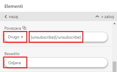 - Lahko kliknete na tekstovni element v nogi sporočila, označite želeno besedo in v preprostem urejevalniku besedila kliknete na simbol za povezavo. Nato se vam v urejevalniku na desni odpre polje za URL naslov, kamor vstavite oznako za odjavo {unsubscribe}{/unsubscribe}.