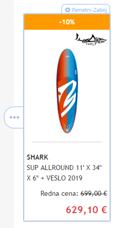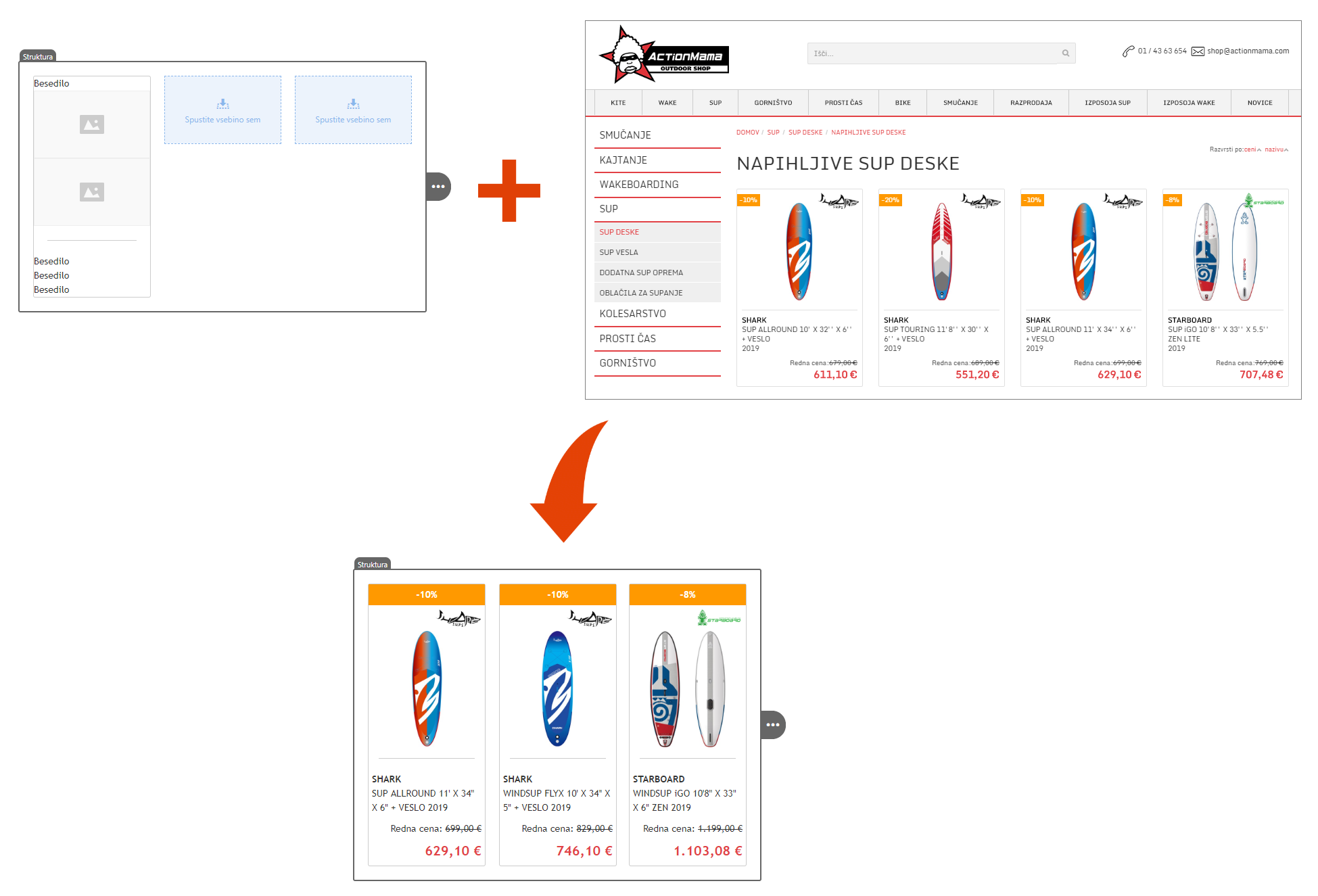 Na primeru spletne trgovine ACTIONMAMA bomo pogledali, kako se ustvari kartica izdelka, ki vsebuje 6 elementov, in sicer višino popusta, logotip, sliko, ter naziv izdelka, staro in novo ceno.