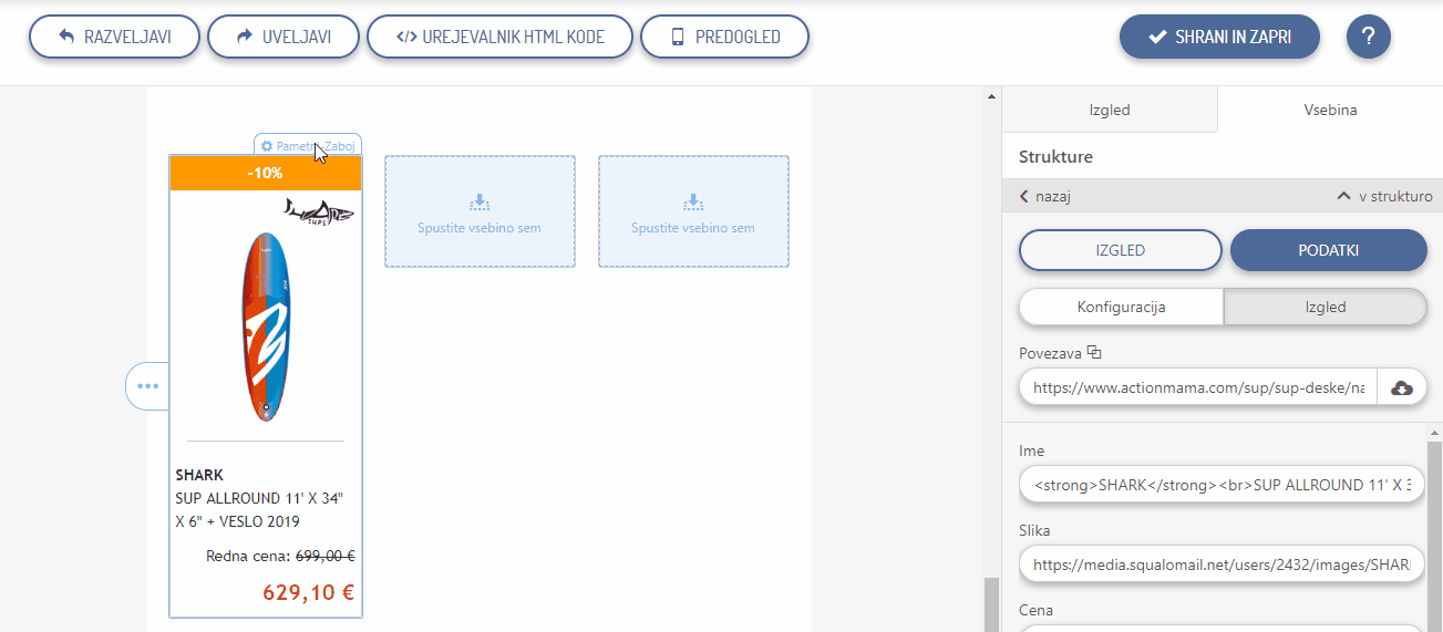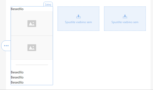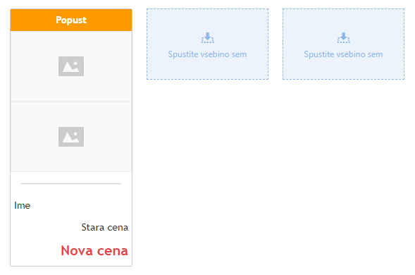 - V prvi zaboj dodamo elemente, ki jih potrebujemo (besedilo, dva slikovna elementa, tri elemente besedila) – tako naredimo “okostje” kartice izdelka.