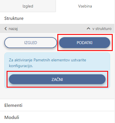 - Nato izberemo zaboj z elementi (za to kliknemo na modro oznako desno zgoraj, kjer piše “Zaboj“), v urejevalniku na desni pa potem izberete zavihek “Podatki” in kliknete na gumb “Začni“, da aktivirate lastnost Pametnih elementov.