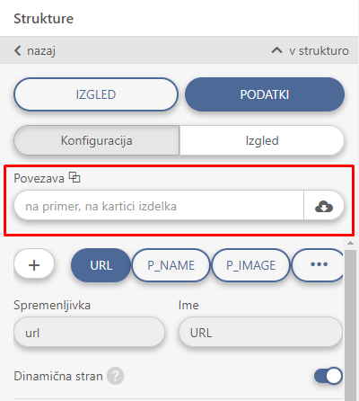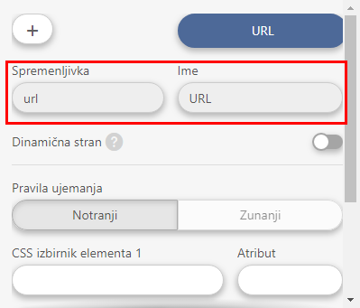Takoj, ko aktivirate pametno lastnost za kateri koli element, se najprej privzeto ustvari spremenljivka URL (te ni mogoče izbrisati).