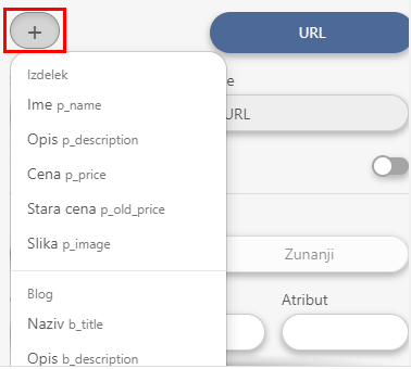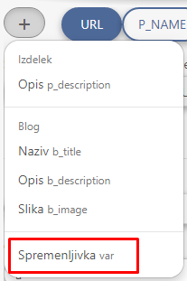 S klikom na ikono za dodajanje spremenljivk (gumb +), se prikaže seznam najbolj priljubljenih, ki se nanašajo na Izdelke ali za Blog.