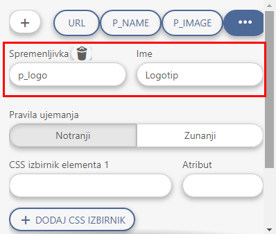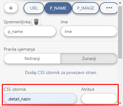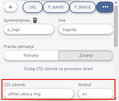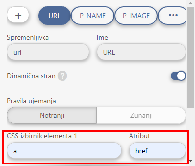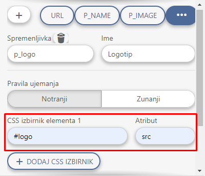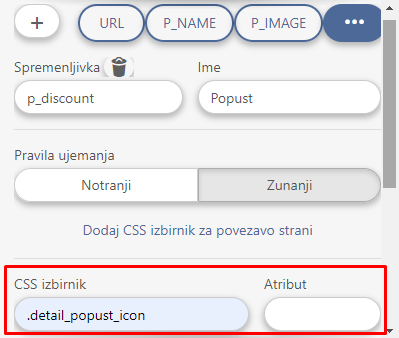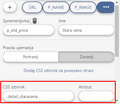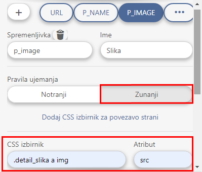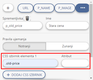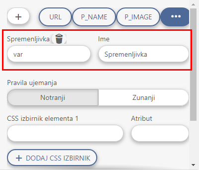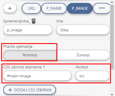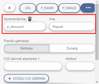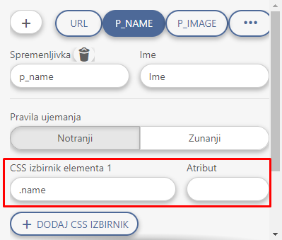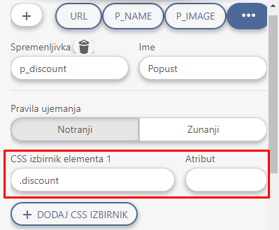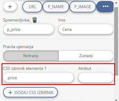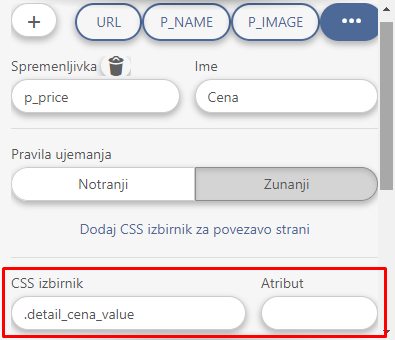 - Zunanji – Tukaj določimo pravila (CSS izbirnik), od kod je potrebno pridobiti vrednosti spremenljivk s spletnega mesta oz. spletne trgovine.