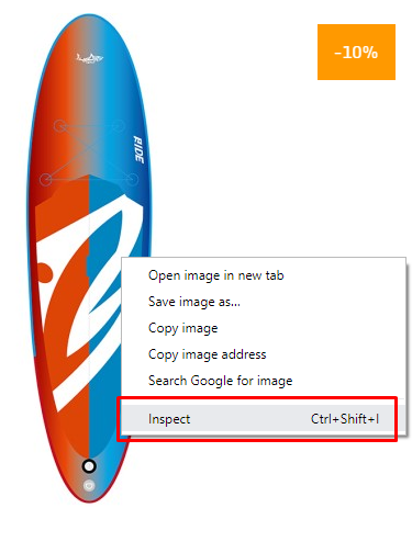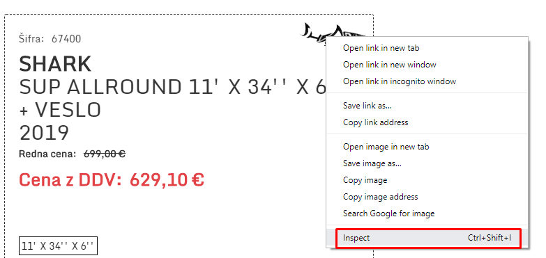 Z miško se postavimo na logotip izdelka, kliknemo z desno tipko in izberemo »Preglej element« (ali v določenih brskalnikih »Preveri« / »Inspect«).