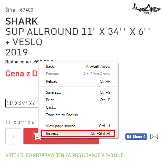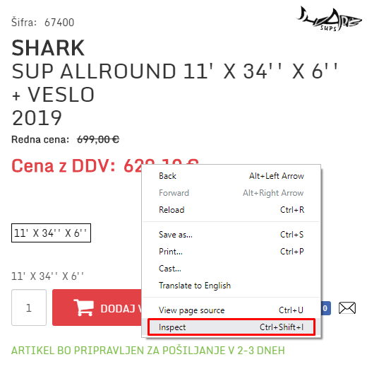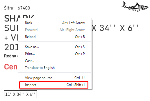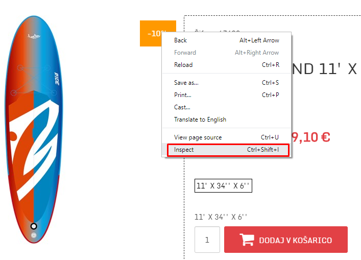 Z miško se postavimo na ime izdelka, kliknemo z desno tipko in izberemo »Preglej element« (ali v določenih brskalnikih »Preveri« / »Inspect«).