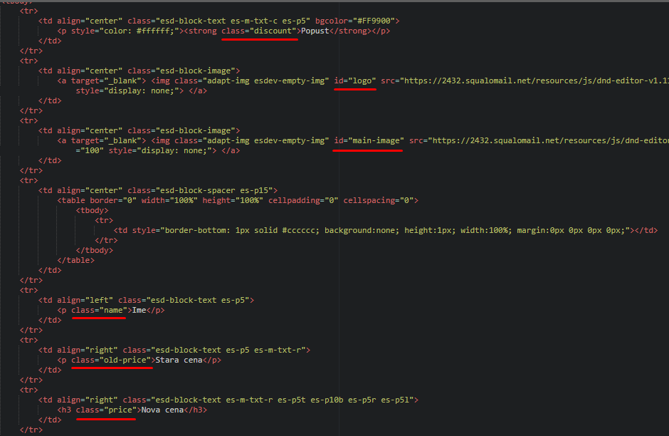 Ker smo nameravali izdelati kartico z višino popusta, logotipom, sliko, ter nazivom izdelka, staro in novo ceno, dodamo (iz razdelka Izdelek) naslednje spremenljivke: