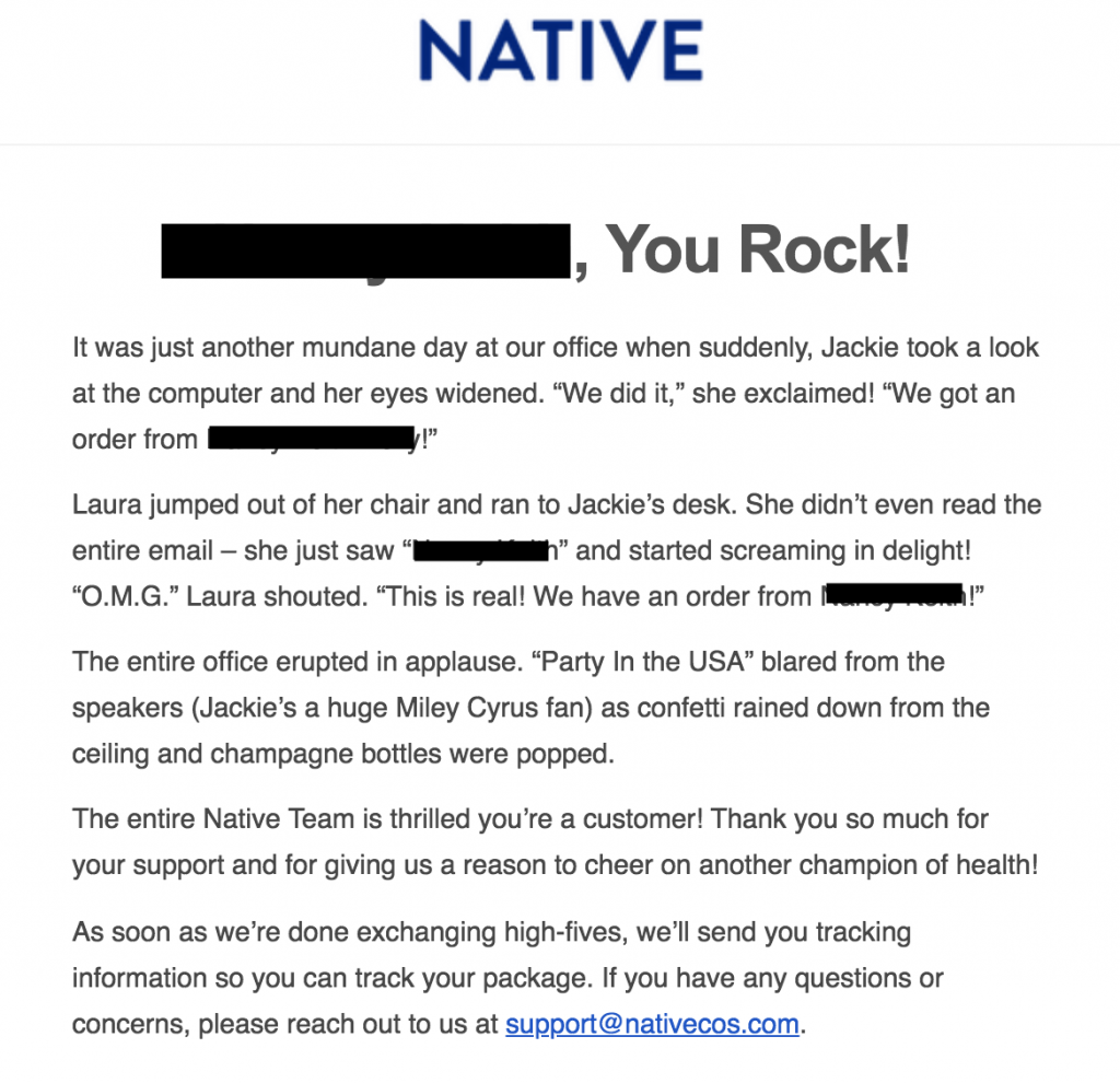 Zabavna sporočila, polna humorja, so pri prejemnikih vedno odlično sprejeta, saj izstopajo v poplavi generičnih e-mailov in nam polepšajo dan. Znamka Native je tako iz potrditvenega sporočila naredila zabavno zgodbo, ki resnično naredi dober vtis in še dolgo ostane v mislih prejemnikov.