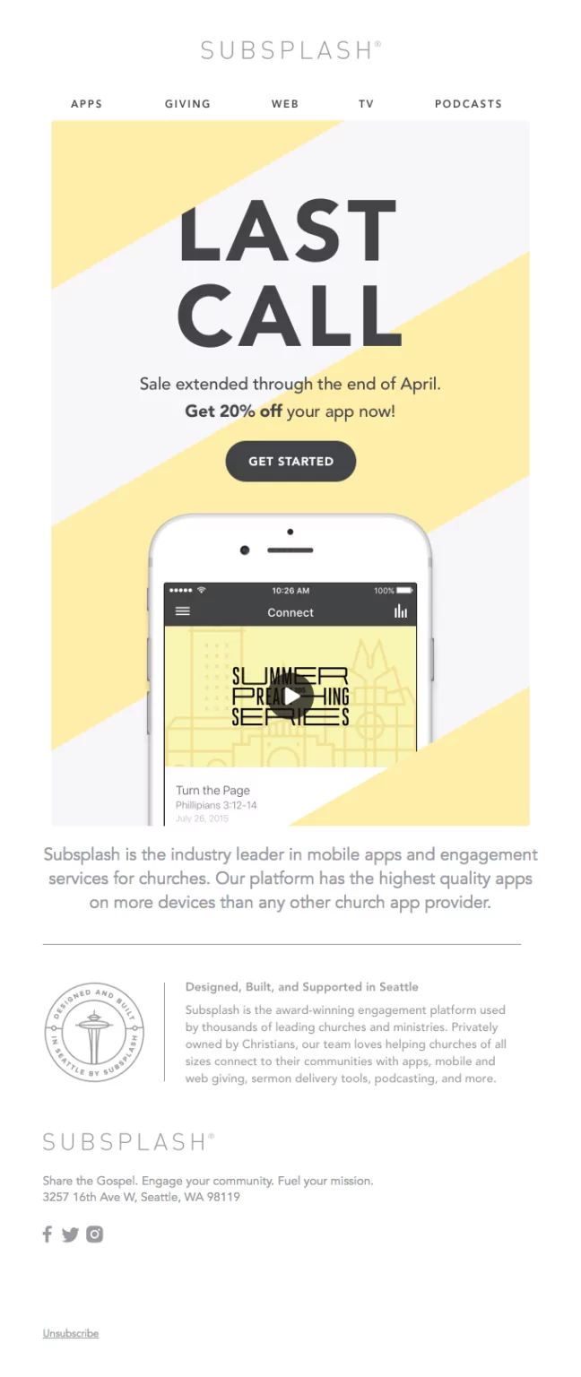 To počne tudi znamka subsplash, ki je svojim B2B strankam poslala učinkovito, a kratko in jedrnato e-poštno sporočilo, v katerem jih obvešča o posebni ponudbi.