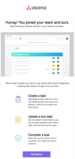 Pri aktivaciji tovrstnih naročnikov vam lahko pomagajo sporočila, kot je denimo sporočilo znamke Asana. Namenjeno je prav aktivaciji B2B uporabnikov, ki so se prijavili na prejemanje sporočil, nato pa so kar nekako izginili.