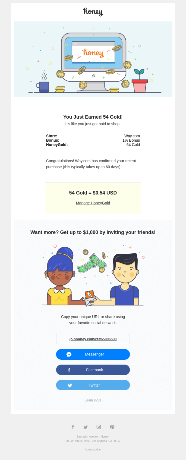To je denimo storila znamka honey, ki je v svojem potrditvenem sporočilu poslala še informacije o številu točk zvestobe, obenem pa prejemnike spodbudila, da k nakupu pritegnejo še druge in si tako prislužijo dodatne točke.