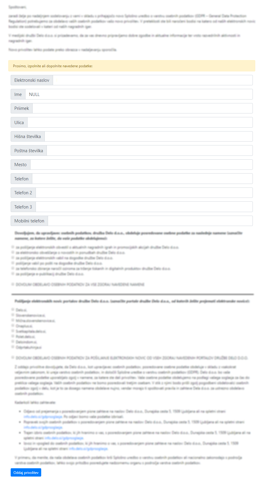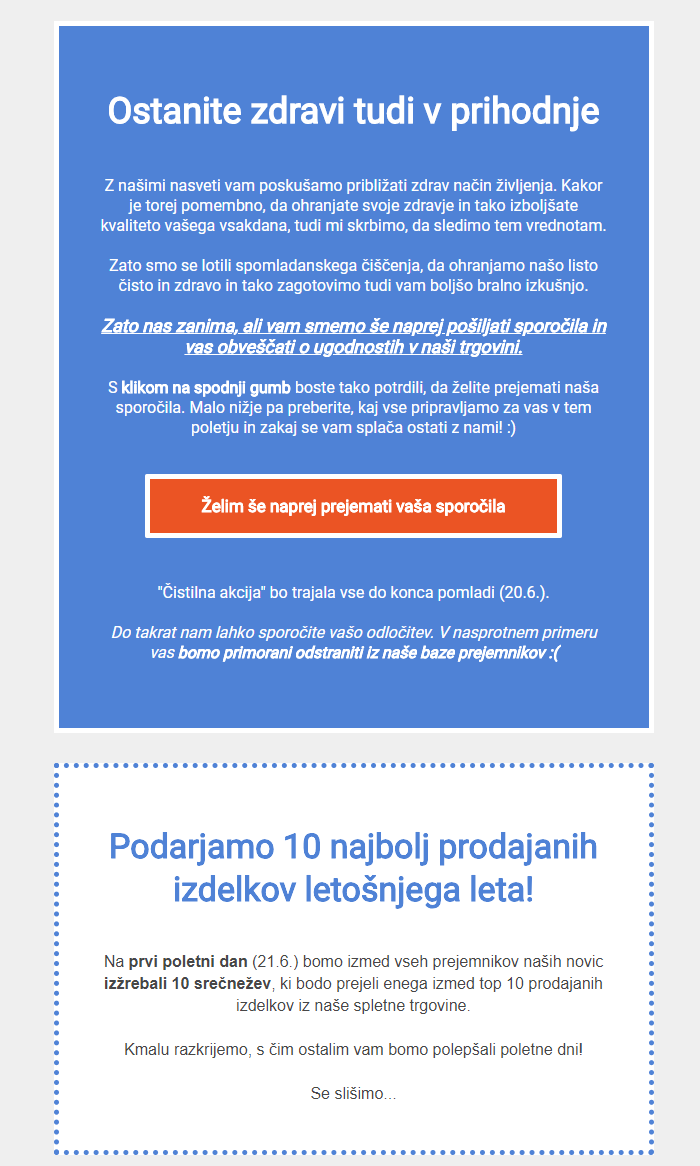 Še en primer, ki ga lahko uporabite kot spodbudo za podanje soglasja, je ta, da prejemnike najprej seznanite z namenom, za katerega obdelujete njihove osebne podatke in jih pozovete, da vam dajo soglasje za pošiljanje novic. Nadalje jih obvestite, da boste njihove podatke v primeru, da soglasja ne dajo, izbrisali.