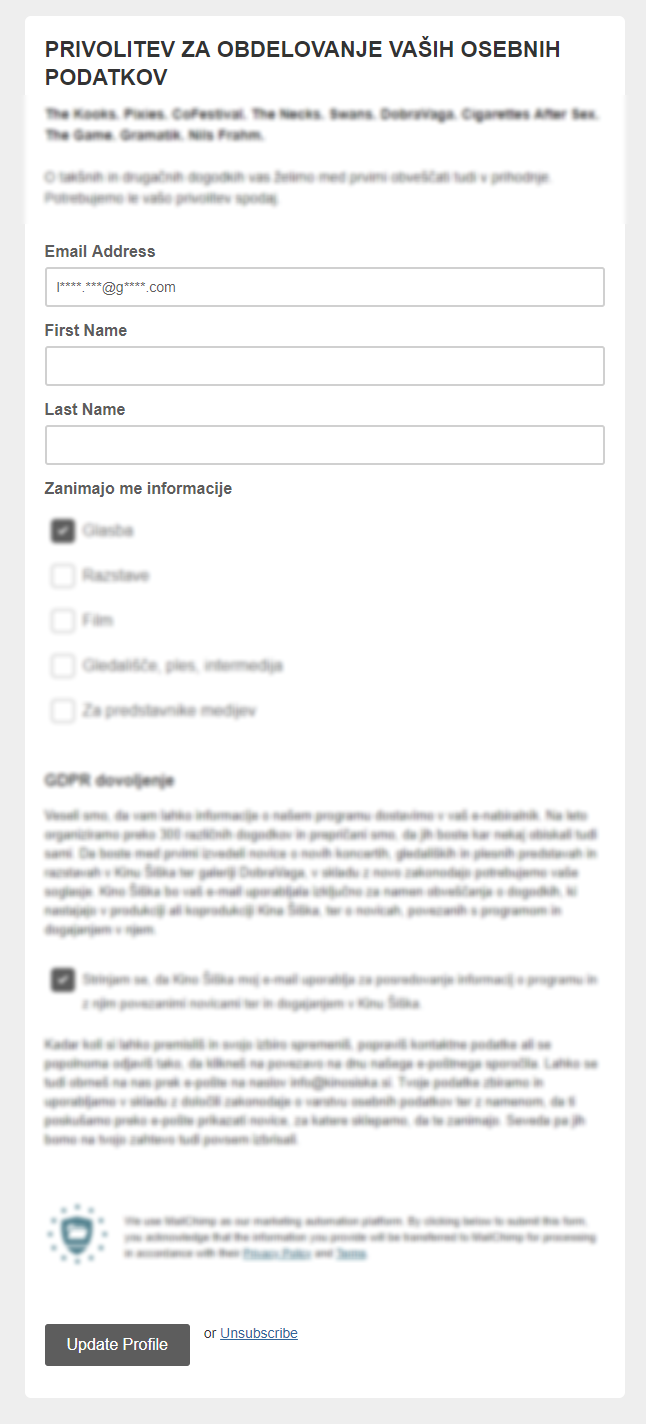 Od prejemnikov poskušajte pridobiti čim manj podatkov oziroma le tiste, ki jih potrebujete za uspešno izvajanje vaših marketinških kampanj. Če zbirate le soglasja za namen pošiljanja, naj bo to edina stvar, ki jo morajo vaši prejemniki potrditi – klikniti na gumb ali obkljukati prazno polje.