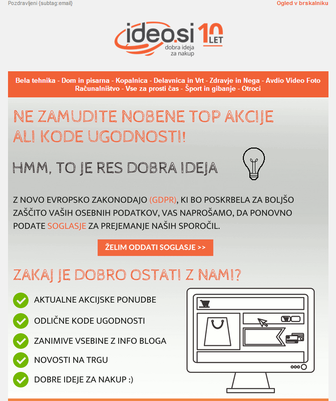 Že takoj na začetku jasno predstavijo, kaj je dobro za prejemnika (»…top akcije, kode ugodnosti…«), kaj je namen tega sporočila in kakšen naj bo prejemnikov cilj (»Želim oddati soglasje«), tudi gumb je jasen in dobro viden.