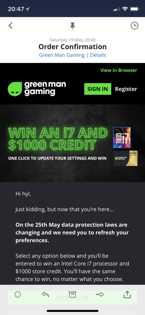 1. Zavajajoča Zadeva sporočila – Pri podjetju Green Man Gaming so se odločili, da bodo prejemnikom poslali sporočila z naslovom “Potrditev naročila” medtem ko bo v samem sporočilu povabilo, naj podajo GDPR soglasje za pošiljanje. Vsekakor neprijetno presenečenje in slaba šala.
