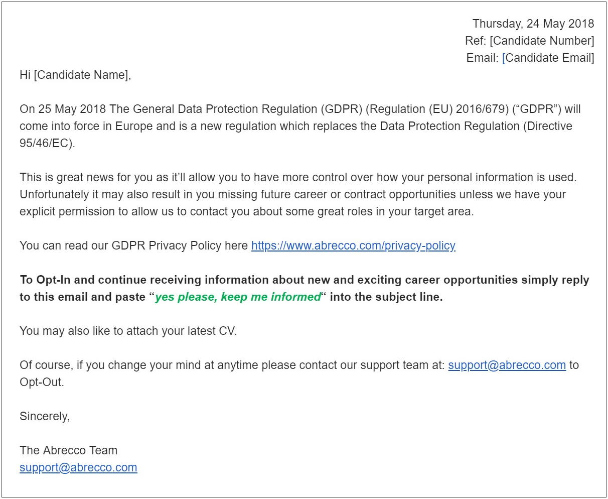 3. Pošlite nam povratni email, da podajate soglasje za pošiljanje – Še en primer, ki ga vsekakor ne vzemite za svojega. Pri podjetju Abrecco team so si način za pridobivanje soglasij zelo otežili – od prejemnikov pričakujejo, da jim bodo soglasje poslali po mailu, kot odgovor na to sporočilo. V današnjem času pa vsekakor obstaja enostavnejši sistem za pridobivanje soglasij, kot ta.